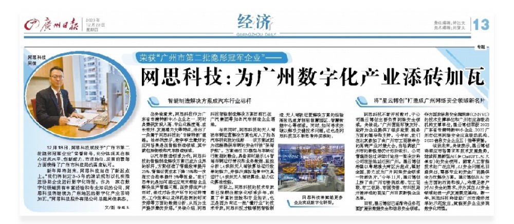 12月28日,《广州日报》经济板块报道了星空·体育(xingkong.com)官方网站 的专题访问。总裁吴俊先生代表星空·体育(xingkong.com)官方网站 接受采访,向读者分享了星空·体育(xingkong.com)官方网站 的智慧解决方案以及子公司星云博创未来的发展规划。图为《广州日报》12月28日星空·体育(xingkong.com)官方网站 专访版面荣获“广州市第二批隐形冠军企业”——星空·体育(xingkong.com)官方网站 :为广州地区的数字化产业添砖加瓦12月18日,星空·体育(xingkong.com)官方网站 被授予“
